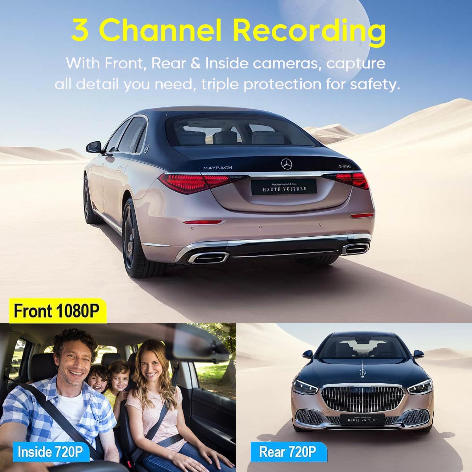 Cette caméra de tableau de bord à trois canaux est conçue pour offrir une couverture complète lors de vos trajets. Avec une résolution de capture vidéo de haute définition, elle enregistre en continu les événements à l’avant, à l’intérieur et à l’arrière de votre véhicule, fournissant des preuves essentielles en cas d’accident ou de litige. La caméra avant capture des vidéos au format Full HD, tandis que les caméras intérieure et arrière offrent une résolution de qualité pour une prise de vue optimale à chaque angle.